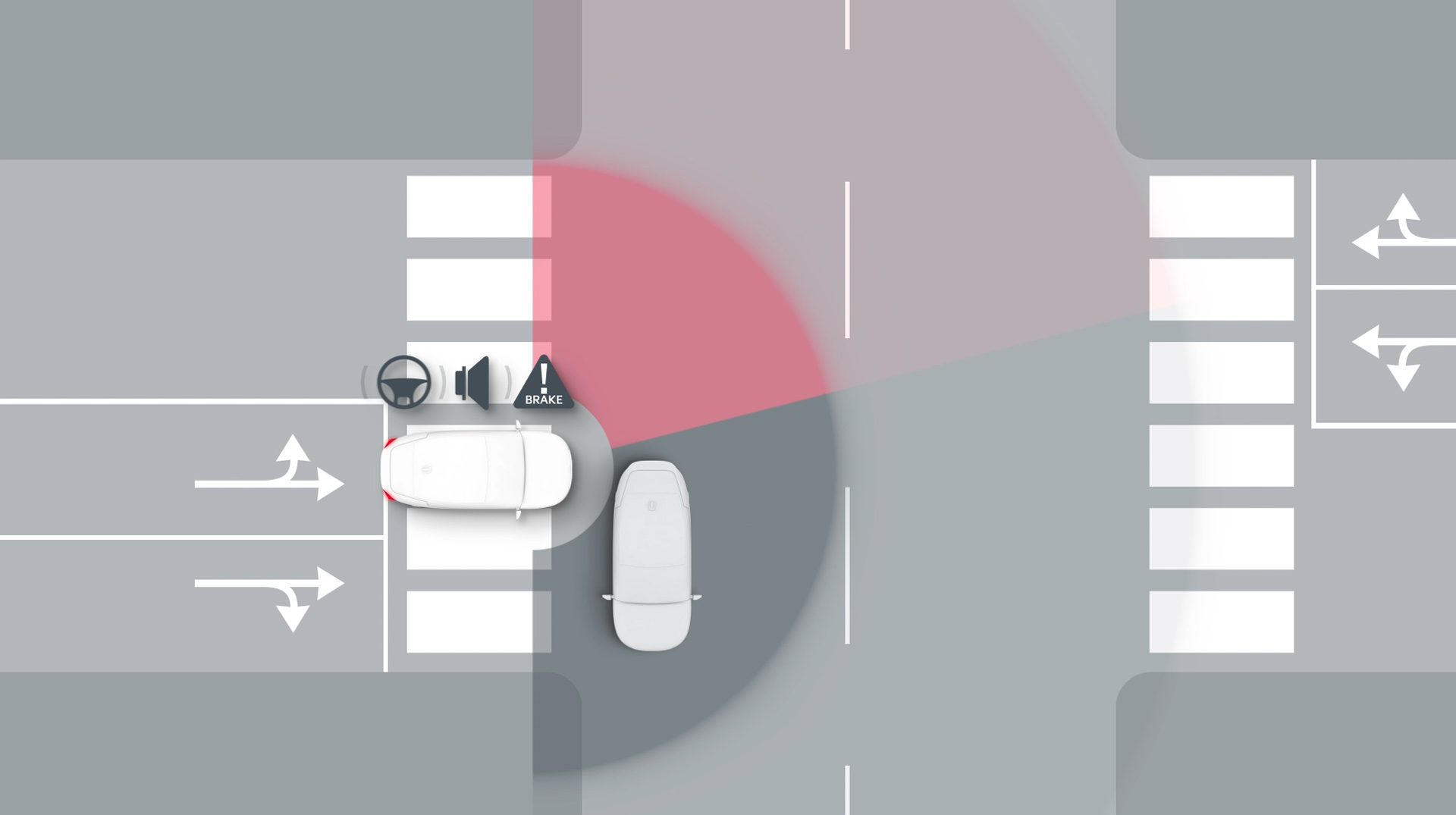 Immer wenn du eine Kreuzung überquerst, wirst du gewarnt, sobald Kollisionsgefahr mit einem von links oder rechts nahenden Auto besteht. Erhöht sich das Risiko nach der Warnung, wird der Bremsassistent aktiviert.*
